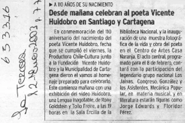Desde mañana celebran al poeta Vicente Huidobro en Santiago y Cartagena [artículo]