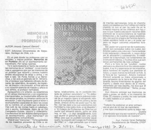 Memorias de un profesor (R) [artículo] Patricio Varas Santander.