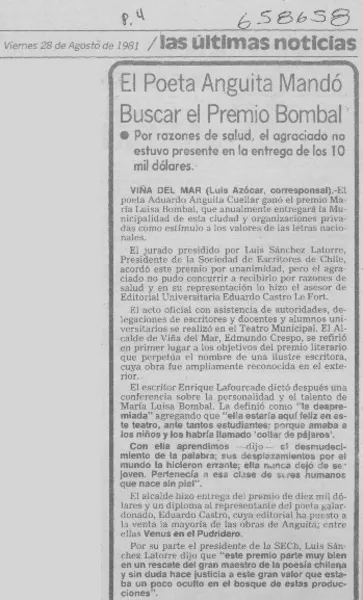 El poeta Anguita mandó buscar el Premio Bombal. [artículo]