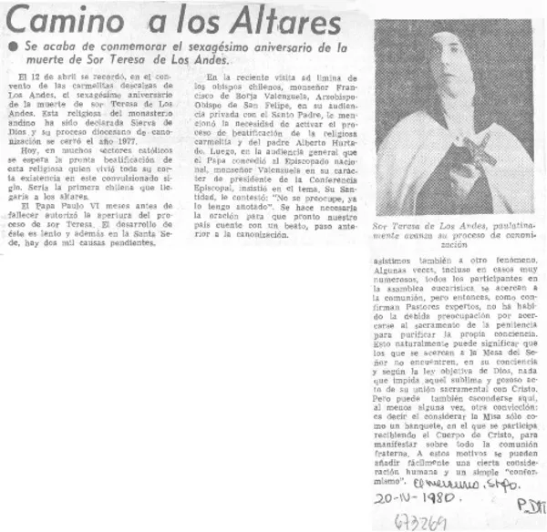 Recuerdan muerte de Sor Teresa de Jesús. [artículo]