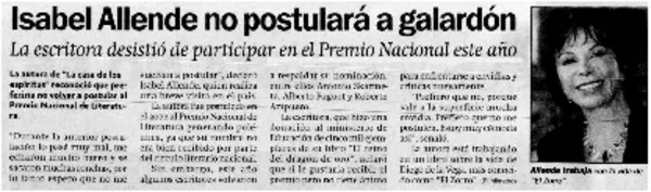 Isabel Allende no postulará a galardón la escritora desistió de participar en el Premio Nacional este año. [artículo] :