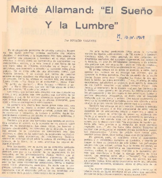 Maité Allamand, "El sueño y la lumbre" [artículo] Ignacio Valente.