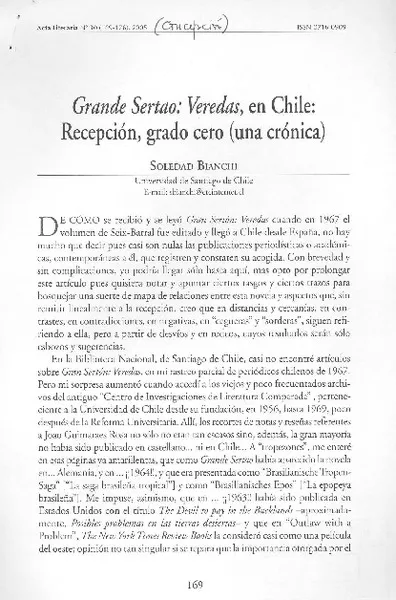 Grande sertao : veredas, en Chile : recepción, grado cero (una crónica) [artículo] Soledad Bianchi