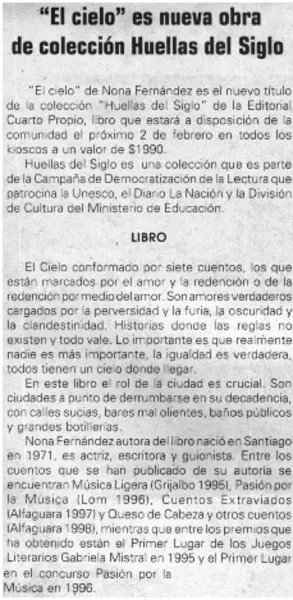 "El cielo es nueva obra de colección Huellas del Siglo" [artículo]