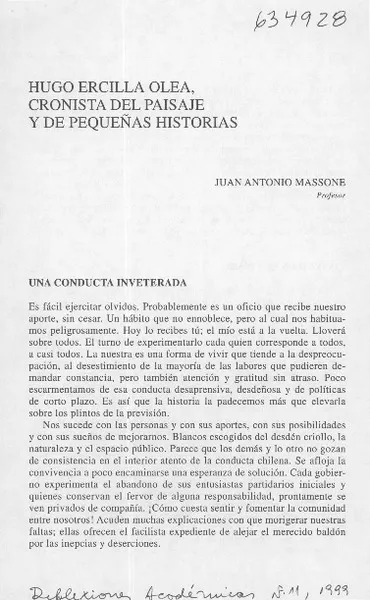 Hugo Ercilla Olea, cronista del paisaje y de pequeñas historias [artículo] Juan Antonio Massone