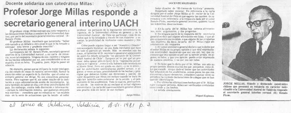 Profesor Jorge Millas responde a secretario general interino UACH. [artículo]