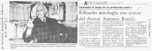 Editarán antología con textos del doctor Antonio Rendic. [artículo]