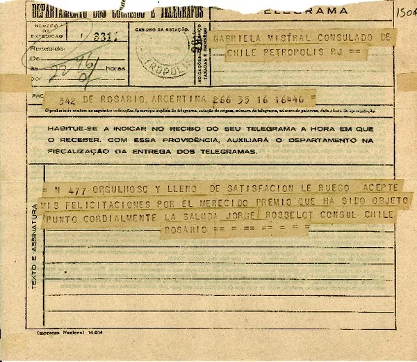 [Telegrama] 1945 nov., Rosario, Argentina [a] Gabriela Mistral, Petróp...