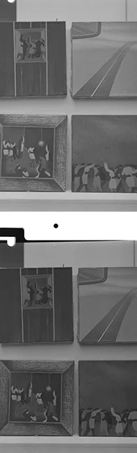 Negativo doble en blanco y negro con el registro de cuatro obras pictó...