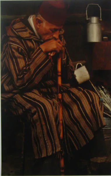 Orientación horizontal. Imagen blanco y negro. Composición en base a dos figuras masculinas de pie, de cuerpo entero, de frente, sonriendo. La figura de la izquierda lleva una capa negra y a su izquierda se ubica una pintura en un atril. Al fondo pinturas en el suelo.