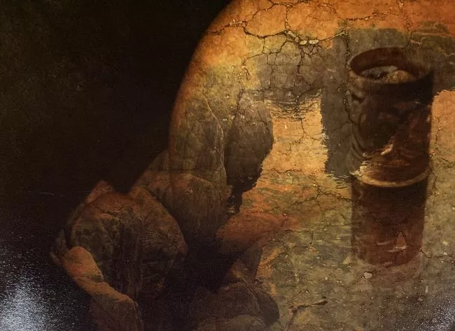 Negativo doble en blanco y negro con dos tomas fotográficas del mismo registro de obra. La obra es la representación de varias formas geométricas que derivan en un foso.