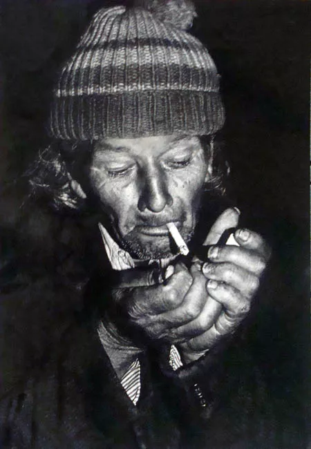 Obra rectangular, orientación vertical. Imagen blanco y negro. Retrato...