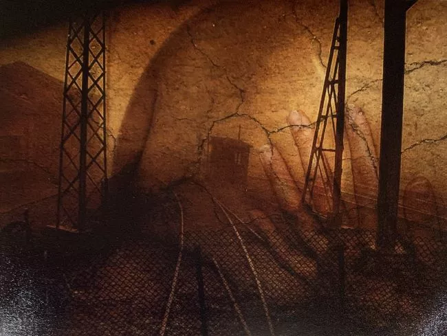 Negativo doble en blanco y negro, de una escultura. La pieza, sobre un plinto, corresponde a una mano abierta, con la palma hacia el cielo, donde sostiene una rama. Las dos imágenes son tomas de distintas ubicaciones en un exterior.