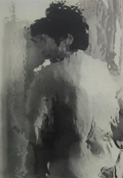 Fotografía en blanco y negro, de formato horizontal. Composición en base a díptico con dos copias de un mismo retrato de una figura femenina de busto. La mujer viste polera clara y dirige la mirada al frente. El fondo es claro y la iluminación es frontal. En la segunda imagen se observa una intervención que recorta y redistribuye la fotografía. Posicionándola sobre una superficie con manchas de variados colores y recortes.
