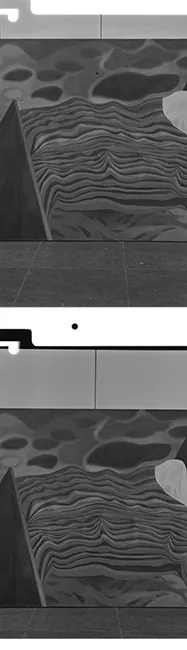 Fotografía en blanco y negro, de formato horizontal. Composición en base a díptico con dos retratos idénticos de una figura masculina de busto. El hombre viste camisa clara, lentes de marco grueso y dirige la mirada al frente. En la segunda imagen se observa una intervención en mancha y figuras de color rojo, azul, amarillo y verde. Se observa una palabra manuscrita en azul en la esquina inferior derecha. El fondo es claro y la iluminación es frontal.