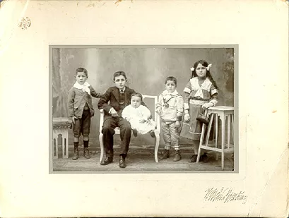 Vista de un parque con figuras femeninas infantiles dos niñas caminando por un paseo, miran de frente a la cámara. En los costados destacan árboles como palmeras y otras especies, bancos para el descanso, esculturas, columnas y una pergola y un coche de guagua.