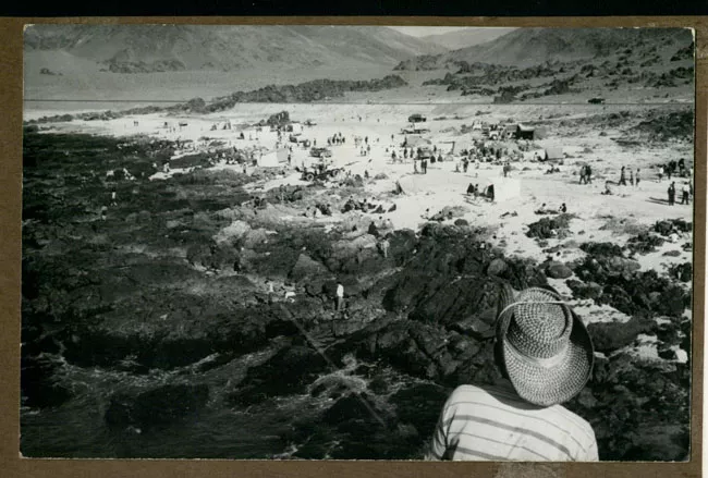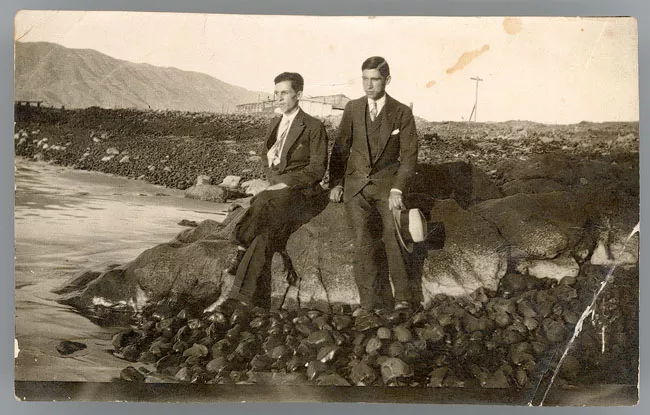 Retrato de dos hombres sentados en una roca frente al mar