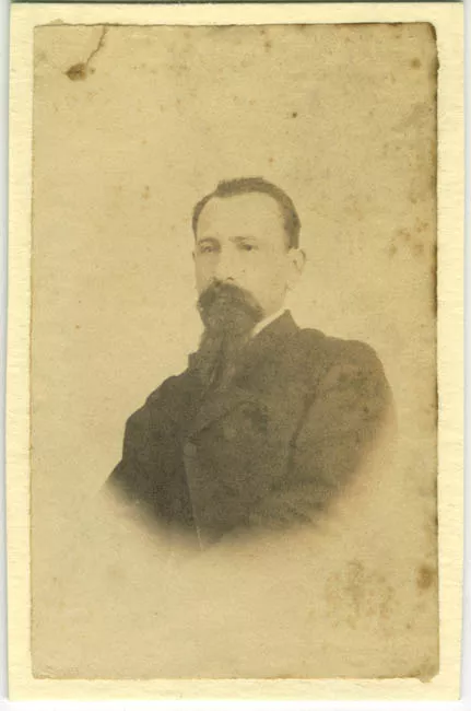 Fotografía blanco y negro, en ella un hombre de barba y bigote. Viste ...