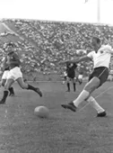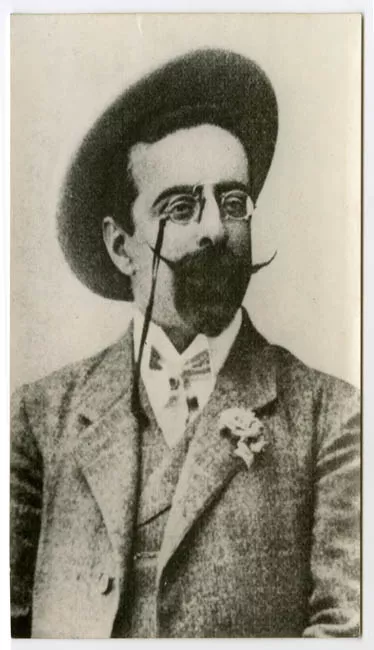 Fotografía rectangular, horizontal y monocromo de un hombre con traje oscuro arrodillado en un reclinatorio. Tras él religiosos y civiles observan el acontecimiento.