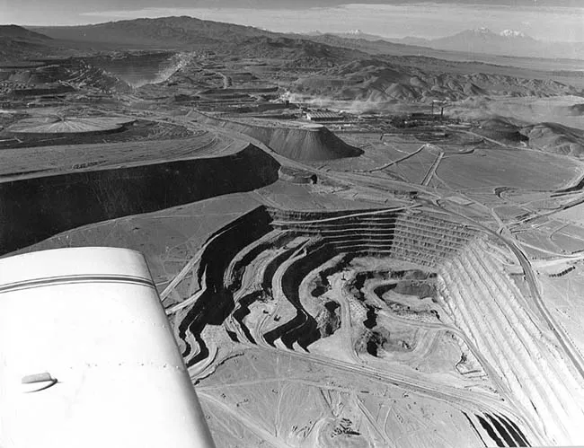 Imagen del tajo de una mina, con forma escalonada. Al fondo se observa...