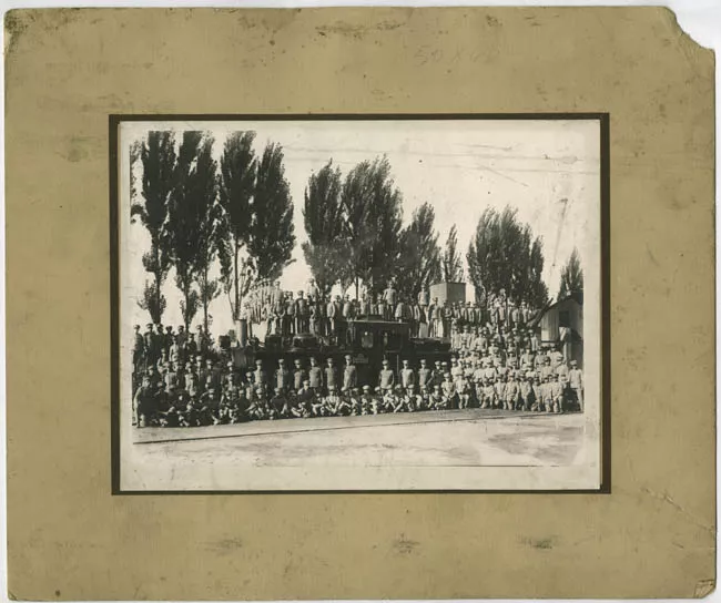 Formato rectangular. Retrato grupal de militares agrupados alrededor d...