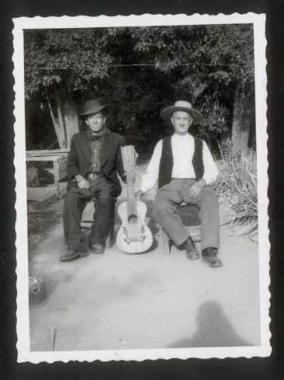 Retrato de dos campesinos junto a un guitarrón