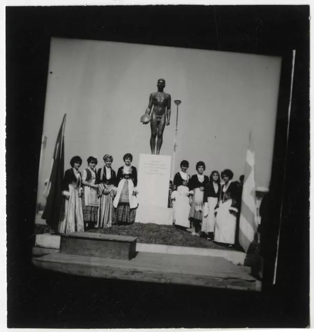 Fotografía blanco y negro de ocho mujeres que rodean estatua de hombre...