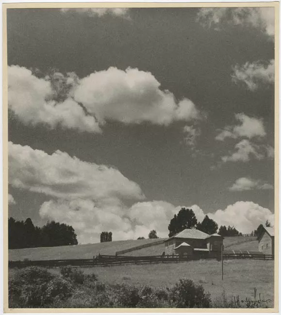 Formato rectangular. Paisaje, casa de madera con cercos de madera ubic...