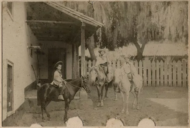 Fotografía rectangular blanco y negro de tres niños a caballo frente a...
