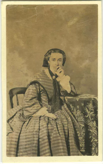 Fotografía blanco y negro, en ella una mujer con peinado, sentada, usa...