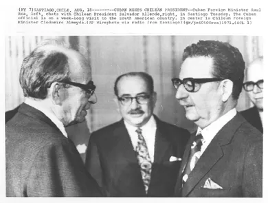 Presidente Salvador Allende, canciller chileno Clodomiro Almeyda y canciller Cubano Raúl Roa