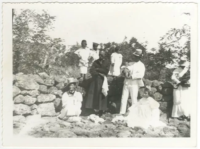 Fotografía blanco y negro de niña sentada frente a fragmento de roca. ...