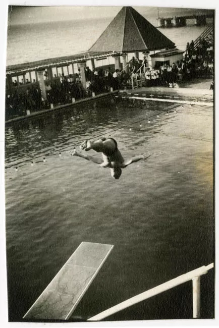 Fotografía blanco y negro de piscina olímpica vista desde lo alto. Al ...