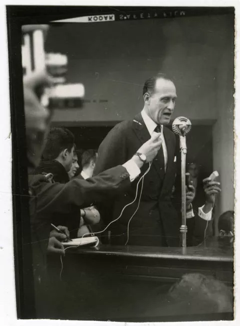 Fotografía blanco y negro de hombre de traje oscuro dando discurso fre...