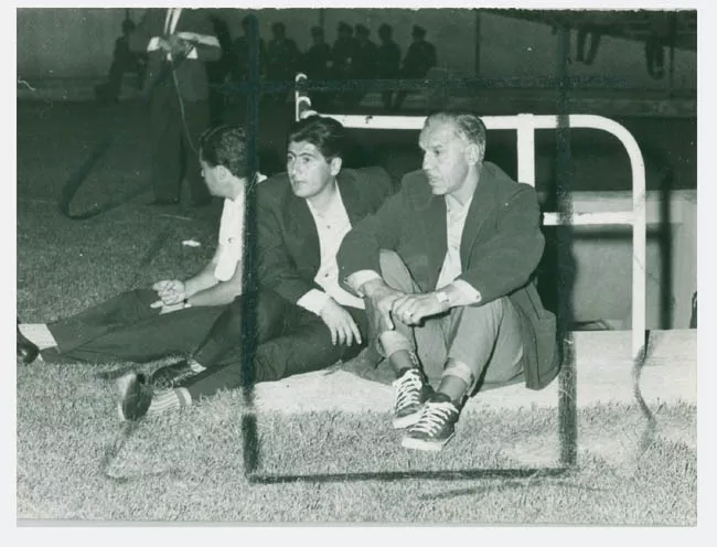 Fotografía blanco y negro de cuatro tenistas en cancha de tenis saludá...