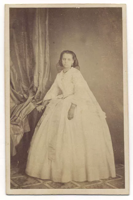 Formato rectangular. Cuatro sujetos en una carroza. Adelante un sujeto vestido con traje elegante y sombrero de copa tiene guantes en la mano y bastón. A su lado joven viste traje y gorra militar con condecoraciones en el pecho, porta guantes blancos. Atrás dos hombres vestidos iguales con sombrero de copa. Al lado de la carroza un militar. Como fondo se observa una edificación con balcón y ventanas. Soporte secundario de cartulina color crema con filete en sobre relieve. Posee sello. La fotografía lleva una cubierta de papel semi transparente con diseño de "telas de arañas" e insectos. Plano medio, toma lateral en 45°, luz natural y foco centrado en los personajes de adelante. El encuadre se cierra sobre los personajes de la carroza remarcando la importancia de estos y de la visita ilustre.