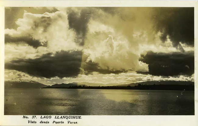 Objeto bidimensional de formato rectangular, dispuesto horizontalmente. La imagen monocroma y con borde negro representa un paisaje con laguna, árboles y un palacio en el fondo.