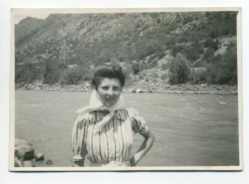 Fotografía rectangular, horizontal, monocromo de una mujer en plano me...