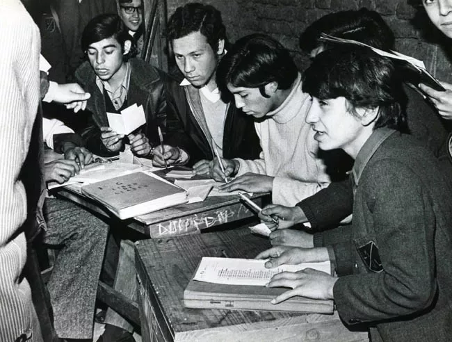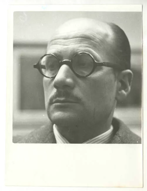 Fotografía rectangular blanco y negro en posición vertical.6 hombres de traje y una mujer de vestido oscuro posan de frente. Tres de ellos se apoyan a una reja de tablas, otros 3 sentados en una banca. Frente a ellos un perro. En el fondo un ventanal.