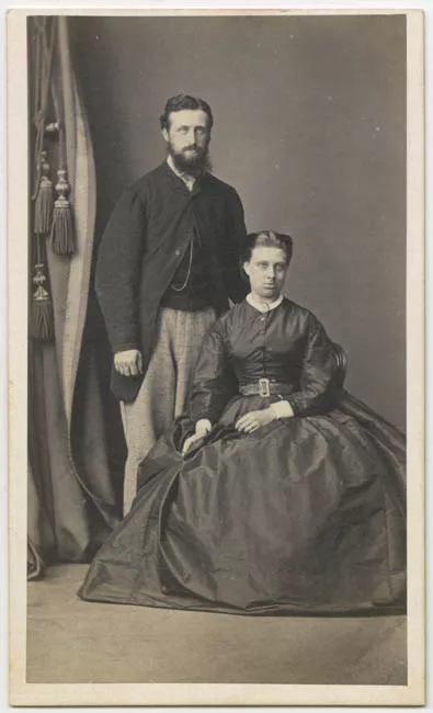 Retrato grupal de hombres y mujeres de edad adulta vestidos de etiqueta, en salón. Al fondo arco de madera flanqueado por dos macetas con plantas. Piso de parquet, muro del fondo empapelado. Primera fila sentados en silla, segunda fila de pie. Al centro del grupo el Intendente y el Contra Almirante.