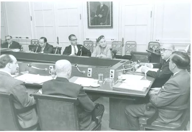 Grupo de jóvenes y niños con tres adultos, uno de ellos en traje sacerdotal. Los jóvenes y niños portan vestimenta militar. El grupo se encuentra organizado en una escalinata y un muro bajo de ladrillo. Al fondo, pasillo con bancas de madera y tres ventanas doble. En primer plano y simétricos se levantan dos trípodes conformados por fusiles con bayoneta sosteniendo en cada uno un tambor y trompeta. Al centro del grupo delante de la escalera, un sacerdote con prismáticos en la mano. Los niños posan con sus sables erguidos. Atrás un joven sostiene un estandarte.