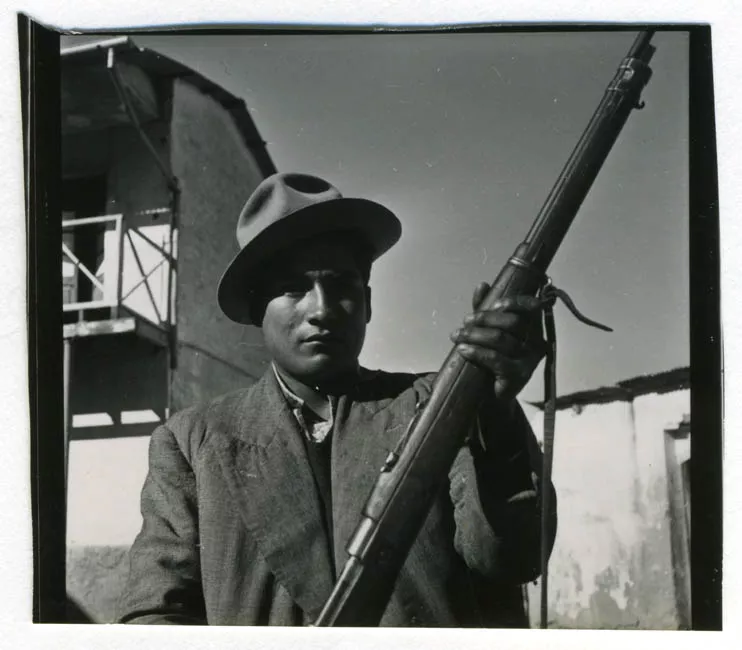 Fotografía en blanco y negro, mitad inferior de la imagen ocupada por el retrato grupal. Encuadre de plano general, foco selectivo grupo a foco fondo desenfocado y sobreexpuesto. Iluminación pareja del grupo. Soporte secundario color café grisáceo y un filete acuñado en sobrerelieve.