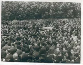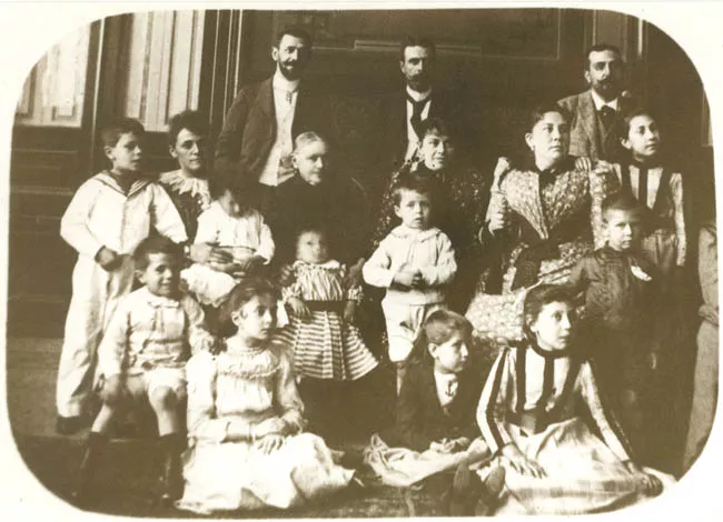 La imagen monocroma, de formato rectangular dispuesta verticalmente, representa un grupo de niños con delantal blanco, jugando en un espacio exterior.