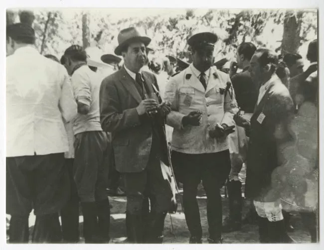 La imagen monocroma, de formato rectangular dispuesta horizontalmente, representa una persona en la parte trasera de un camión cargado con hortalizas, al costado izquierdo una multitud de personas.