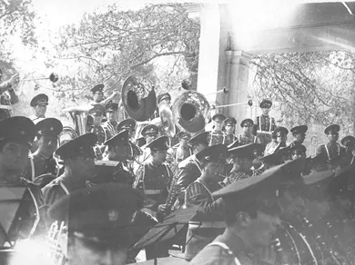 La imagen monocroma, de formato rectangular dispuesta horizontalmente, representa un hombre de medio cuerpo, con casco y picota.