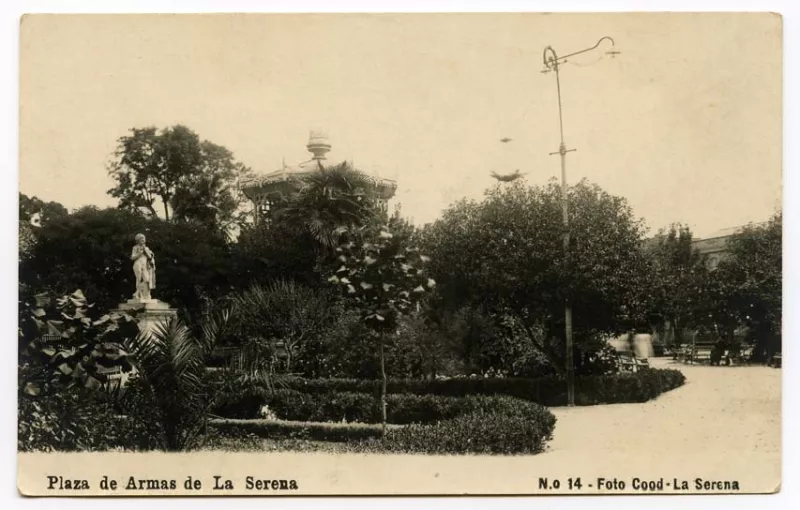 Copia fotográfica en blanco y negro, de formato rectangular y orientación horizontal. En primer plano, una figura femenina montada a caballo posa de frente a la cámara sobre un terreno amplio y despejado. Viste abrigo claro de textura gruesa y pantalones oscuros; mantiene ambas manos sobre las riendas. El caballo, de pelaje oscuro, permanece inmóvil. En segundo plano, se observa un terreno pedregoso y, más atrás, un cerro cubierto de árboles de follaje denso. A la derecha, una cerca baja se extiende paralela a la línea del horizonte. La fotografía está adherida a una hoja de álbum, y bajo ella se observa una inscripción manuscrita en tinta negra, de carácter identificatorio.
