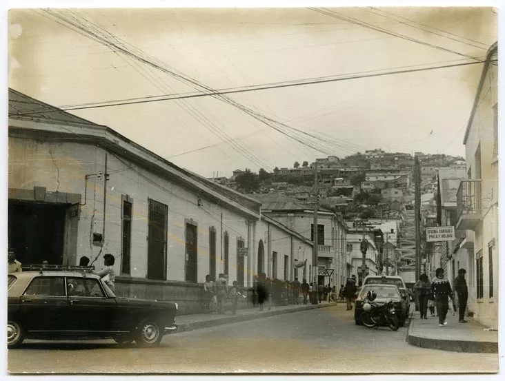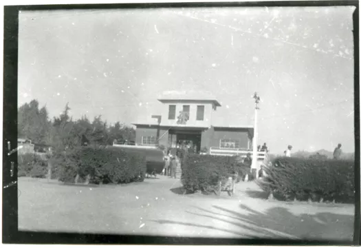 Copia fotográfica en blanco y negro virada a sepia, de formato rectangular y orientación horizontal, adherida a cartón de color gris verdoso. En primer plano, se observa un numeroso grupo de figuras masculinas y algunas infantiles, distribuidas en múltiples niveles y alineadas frente a la gradería de madera. La mayoría de las personas viste traje formal con sombrero, mientras que otros aparecen con vestimenta clara, y algunos posan de pie y otros sentados junto a una mesa ubicada en el centro. Al fondo, se distingue una estructura de madera con aberturas verticales, correspondiente a la galería, sobre la cual también se disponen espectadores. En la parte inferior del soporte se observan varias inscripciones manuscritas en tinta oscura, un timbre con numeración visible al centro y un sello en relieve en la esquina inferior derecha. El cartón presenta manchas, desgaste en los bordes y esquinas levemente redondeadas.