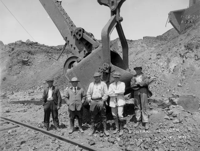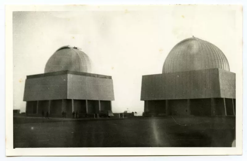 Copia fotográfica en blanco y negro, de formato rectangular y orientación vertical. En primer plano, grupo de figuras masculinas adultas desciende por una escalinata de piedra, captados de cuerpo entero. Al centro, dos de ellos avanzan uno junto al otro, ambos con sombrero y abrigo largo; el de la izquierda lleva un abrigo claro y el de la derecha uno oscuro. A la derecha, se observa otro conjunto de figuras también con trajes formales y sombreros, uno de los cuales sostiene el sombrero en su mano. En segundo plano, se distingue una obra arquitectónica de grandes dimensiones, con cúpula y columnas corintias, así como faroles ornamentales y una bandera. La imagen presenta leve desgaste y rayas finas en el borde superior derecho.