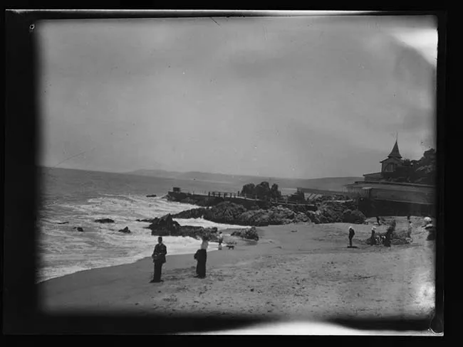 Objeto monocromo rectangular de disposición horizontal. En primer plano se divisa foliaje de árboles que bordean la zona inferior de la imagen y se extienden por todo su ancho. En el centro inferior se identifica un palacio de estilo neoclásico frente a una explanada nevada rodeada de edificaciones con techumbres nevadas que se extienden hacia el tercio superior de la imagen, punto en el cual se divisan extensiones de tierra a lo ancho de la fotografía. En el fondo, una alta cadena montañosa nevada, sobre la cual se ve cielo cubierto con nubes grises.