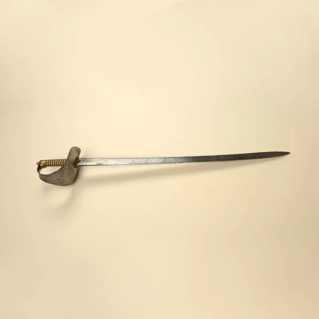 Arma blanca de mano, corto-punzante. Compuesta por empuñadura, hoja y vaina. Empuñadura constituida por pomo de bronce, mango estriado cubierto de cuero con trenzado de bronce; guardamano que se desprende desde el pomo hasta la cazoleta de bronce. Hoja de acero curvada de un solo filo con vaceo central, terminada en punta redondeada. Vaina de metal curva, con dos abrazaderas en su parte media, ambas rematadas en anillas.